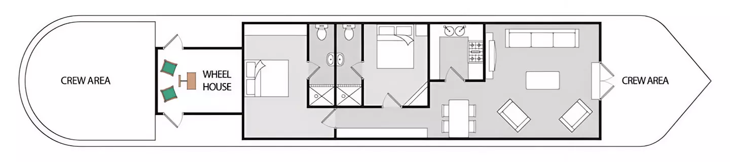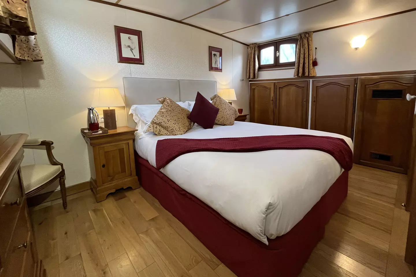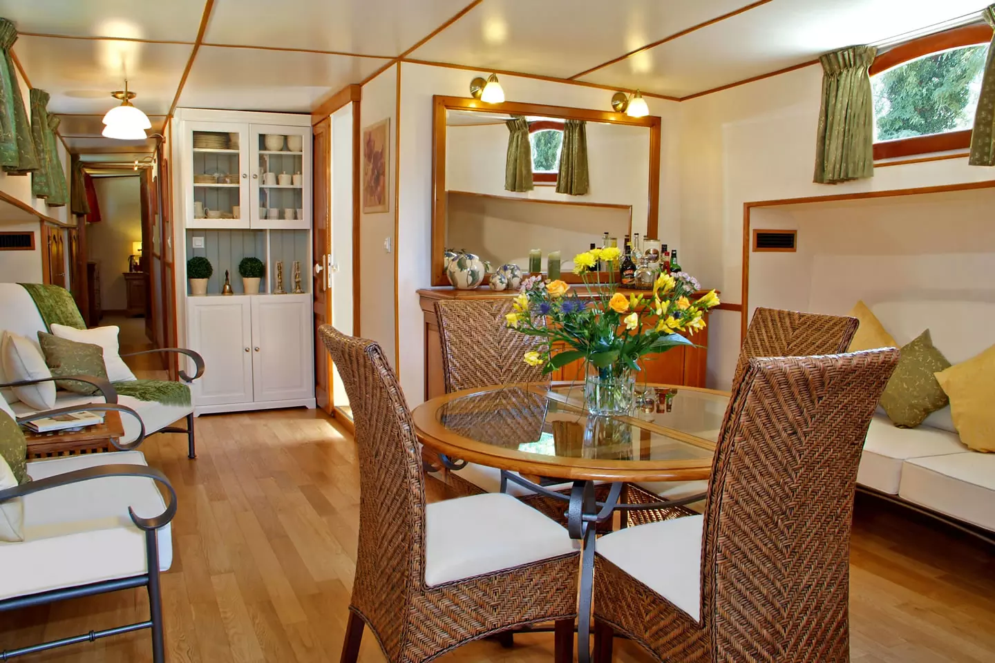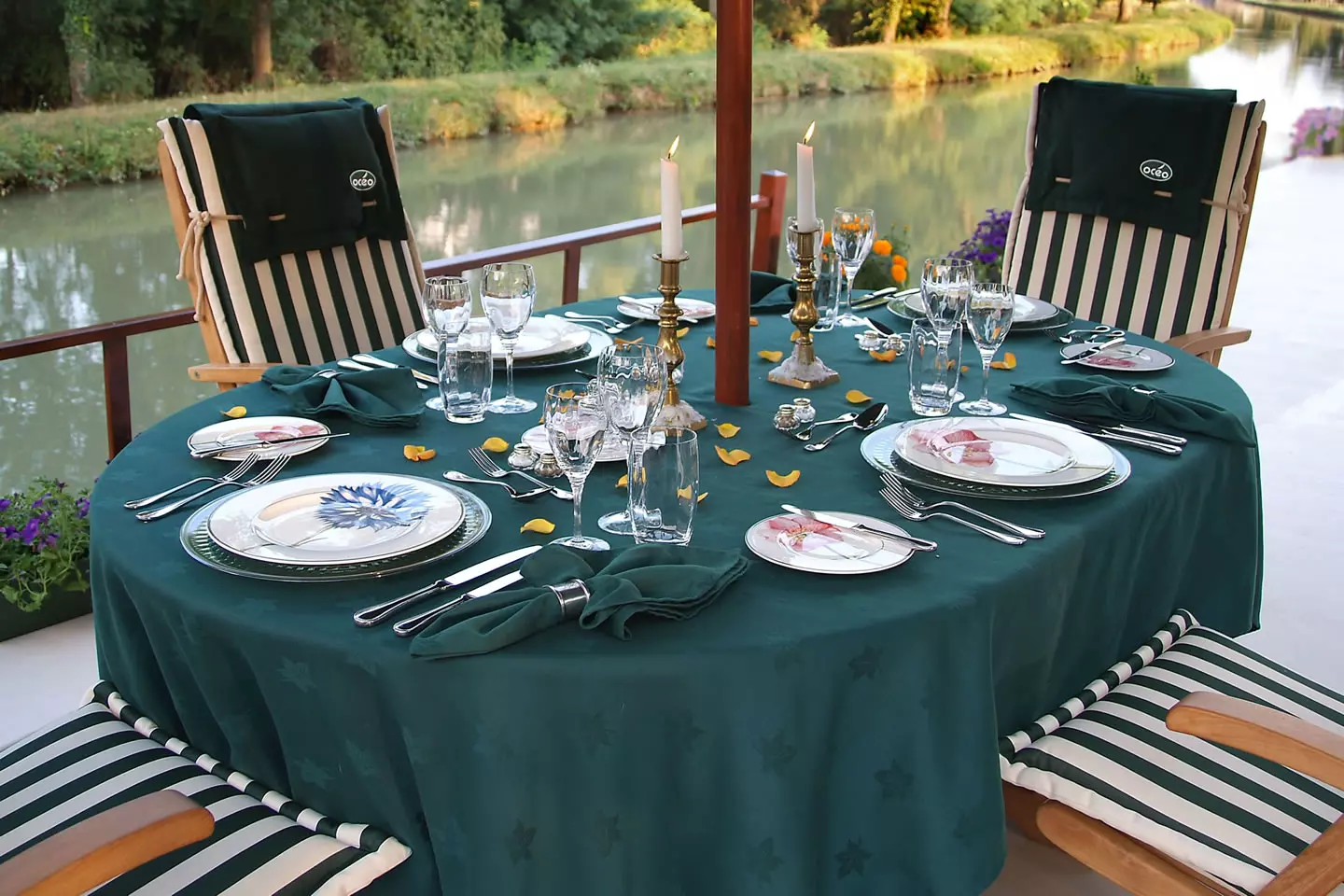 The large deck space allows for comfortable al fresco dining enhanced by our canopy umbrella, and if needed a canopy heater, for perfect comfort throughout the season. All meals are served on beautiful Villeroy & Boch crockery, accompanied by elegant crystal glasses to enhance the dining experience. There are lounge chairs with individual parasols to relax in, cooled by the gentle breeze as we cruise along. Take the chance to relax and find yourselves in awe of the scenery as we pass by ancient villages and vineyards.