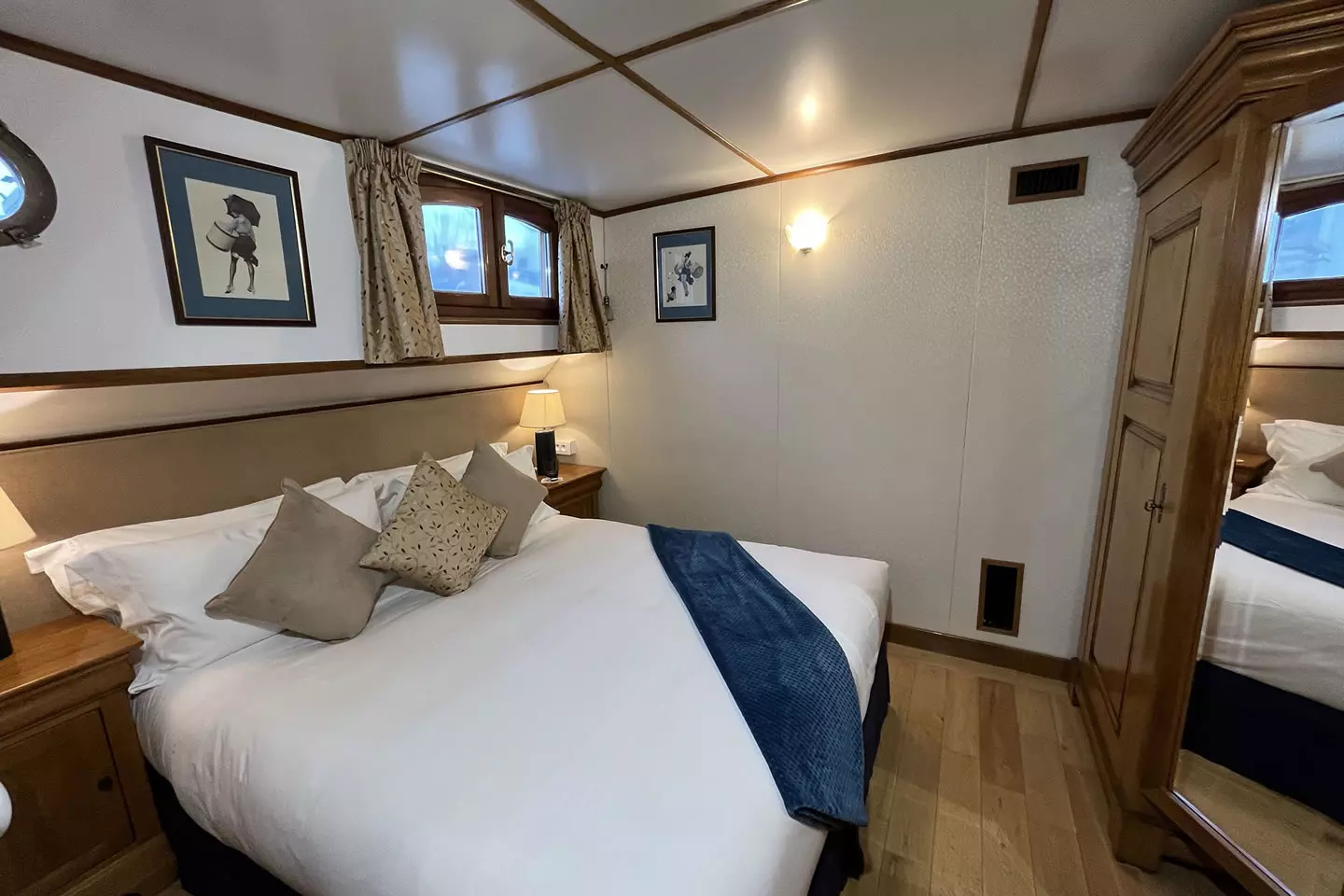 Sleeping accommodation is in two generous staterooms with walk around beds and modern en-suite bathrooms. The beds are European king-size, or if prefered, two twin beds to afford flexibility to guest’s arrangements. The cabins are furnished with French oak furniture with ample hanging space and drawers to unpack into and feel at home. The linens are of luxurious quality Egyptian cotton, with silk duvets for comfortable summer nights. The bathrooms are modern with large showers, heated towel rails, hairdryers and bathrobes.